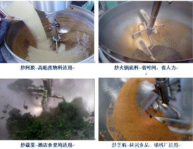 行星攪拌炒鍋攪拌系統(tǒng)采用自轉(zhuǎn)公轉(zhuǎn)相結(jié)合的方式,其傳動(dòng)比為不整數(shù)傳動(dòng)比,保證鍋內(nèi)無任何攪拌盲點(diǎn)。行星攪拌炒鍋可用于炒菜、煮粥、煮筍干、熬湯、燒水、煮飯、化糖、化膠、熬糖稀、熬油、炒餡料(蓮蓉餡、月餅餡、綠豆餡、豆沙餡等)、糕點(diǎn)、飲料、蜜餞、醬料(如:豆瓣醬,甜面醬,花生醬,辣椒醬,牛肉醬、火鍋底料、方便面醬料、香菇醬等)等食品行業(yè)以及制藥(藥材和焙烤)與日用化工等行業(yè)。不同物料,設(shè)計(jì)細(xì)節(jié)不同。