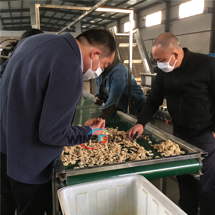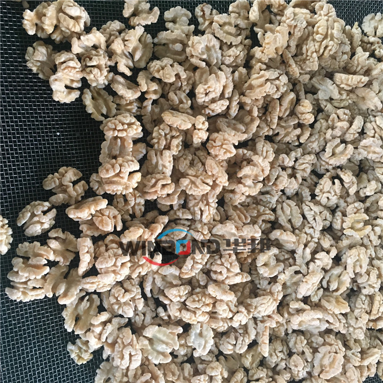2.滾筒脫皮:采用高壓循環(huán)水泵可以快速、洗掉核桃仁表面的泥垢、表皮。清洗后進入清水噴淋區(qū),然后進入振動篩,由振動篩將大部分水珠震動掉后進入風干線或烘干機,風干或烘干完畢后進入下一道工序。生產(chǎn)線可實現(xiàn)變頻調速、自動控溫,節(jié)水。