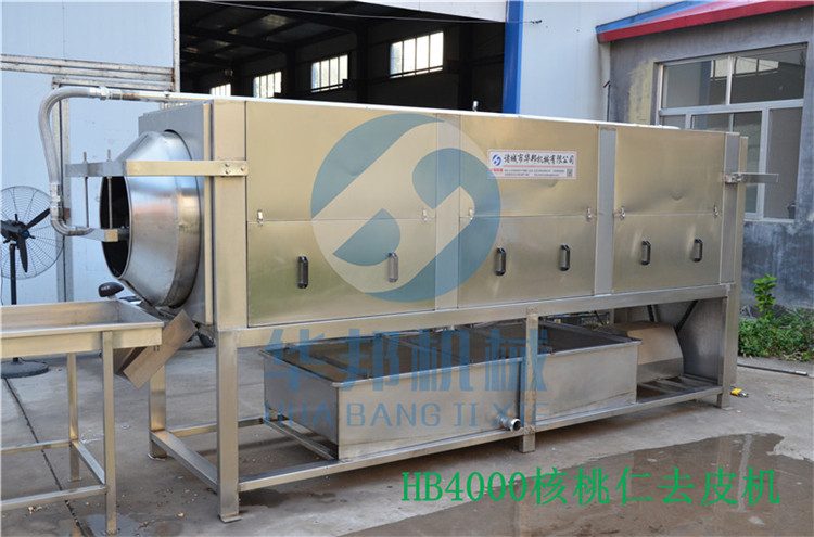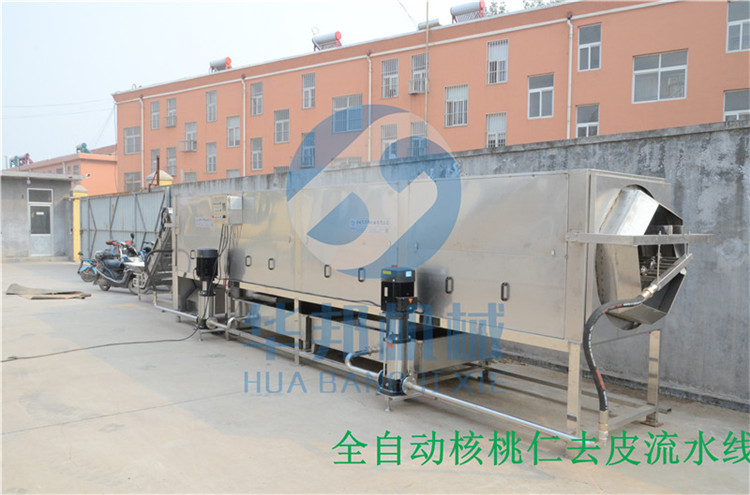 核桃仁脫皮加工流水線組成:浸泡漂燙------滾筒脫皮------氣泡清洗-----烘干線