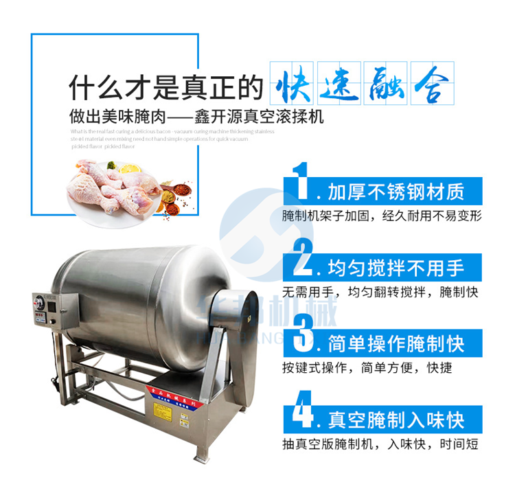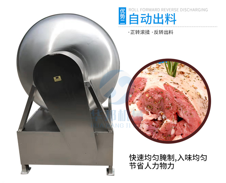 如果您還在為牛肉雞肉鴨肉腌制時(shí)間長(zhǎng)發(fā)愁,如果您還在苦苦尋找快速腌制機(jī),如果您想提高您的產(chǎn)品產(chǎn)量,那您就需要采購一臺(tái)適合您產(chǎn)量的真空滾揉機(jī),采用呼吸式一呼一吸快速腌制的方法,通過對(duì)產(chǎn)品的摔打,滾揉,讓您的產(chǎn)品更細(xì)膩,腌制速度越快。本來您需要腌制一星期的產(chǎn)品,用我們的滾揉機(jī),您可以在一小時(shí)內(nèi)腌制成功,并且比自然腌制的效果更好。