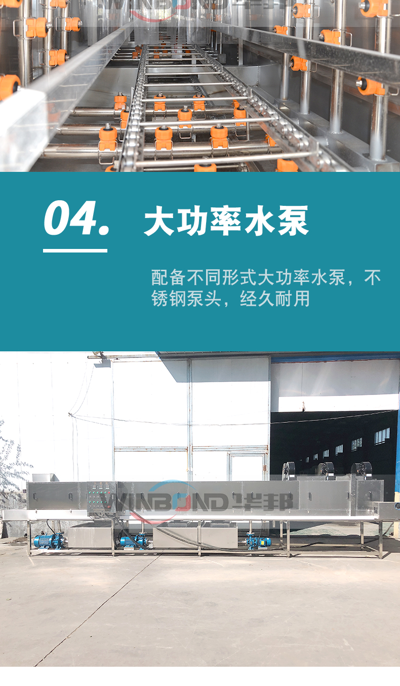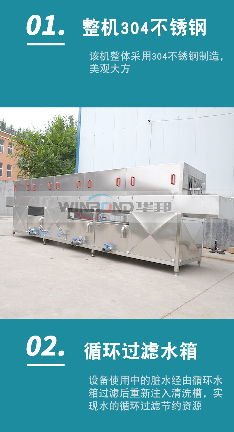 華邦機(jī)械洗筐機(jī)以高壓噴淋沖洗為主要的清洗方式,依次進(jìn)行預(yù)洗、高壓清洗、漂洗,將筐子清洗干凈。采用連續(xù)式清洗,以提高清洗效果,經(jīng)廣大用戶實(shí)際使用證明,該設(shè)備對各類筐子清洗效果明顯,清洗能力大,去污效果好,節(jié)能節(jié)水,大大提高了清洗效率,降低了清洗成本。
