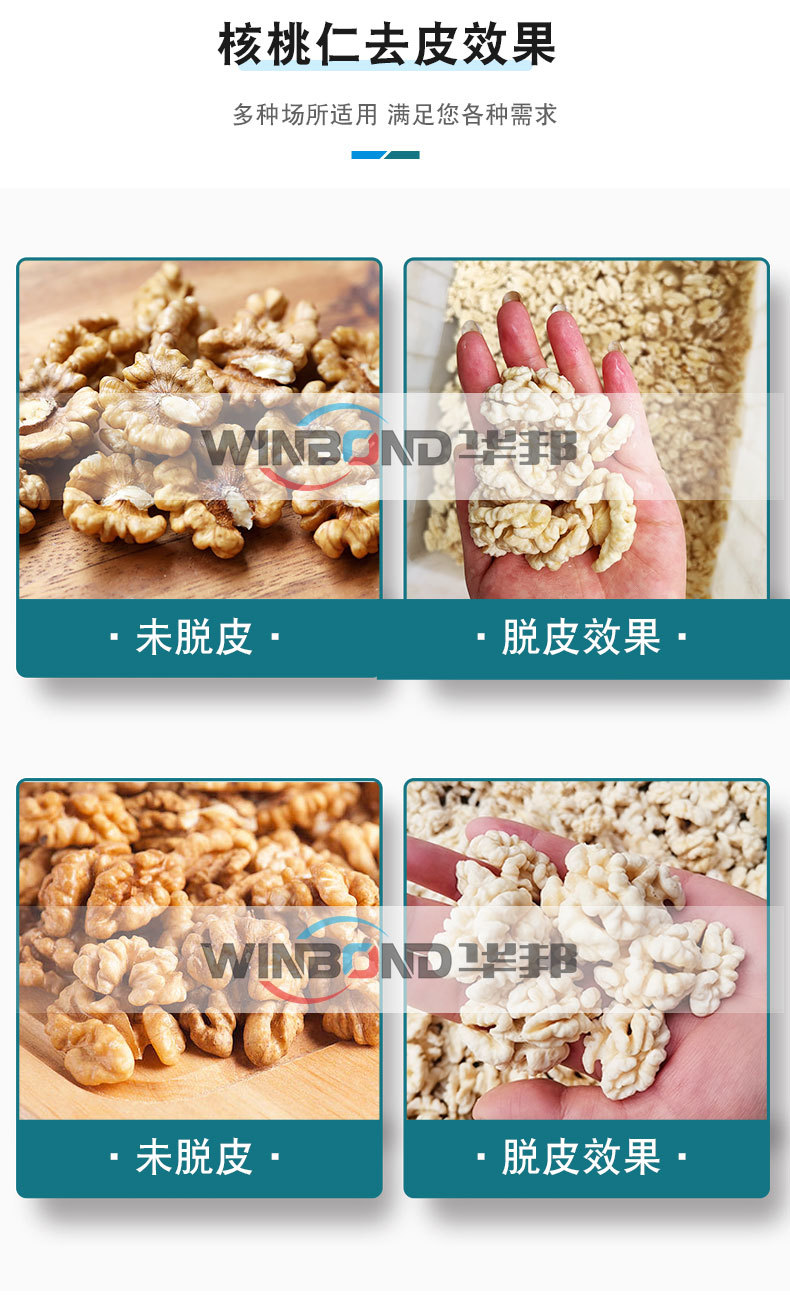 傳統(tǒng)的核桃仁銷售方式你進(jìn)價格便宜,為了快速消耗掉當(dāng)年的核桃仁,刺激消費(fèi)者購買,必須將核桃仁進(jìn)行深加工,做成各種脫皮原味核桃仁,不僅改善了口感,價格也會翻好幾倍,有新疆,云南,四川,陜西,山西,河北,湖北,山東等地區(qū)。不少廠家為此苦惱。影響口感和視覺,為解決這一大苦惱近年來我們專注于研發(fā)的這款核桃仁去皮機(jī)能為您解決這一大難事。而且,去皮以后的核桃仁價錢遠(yuǎn)遠(yuǎn)高于普通的核桃仁。