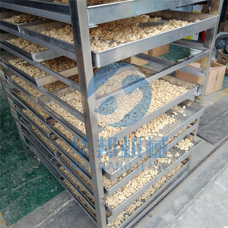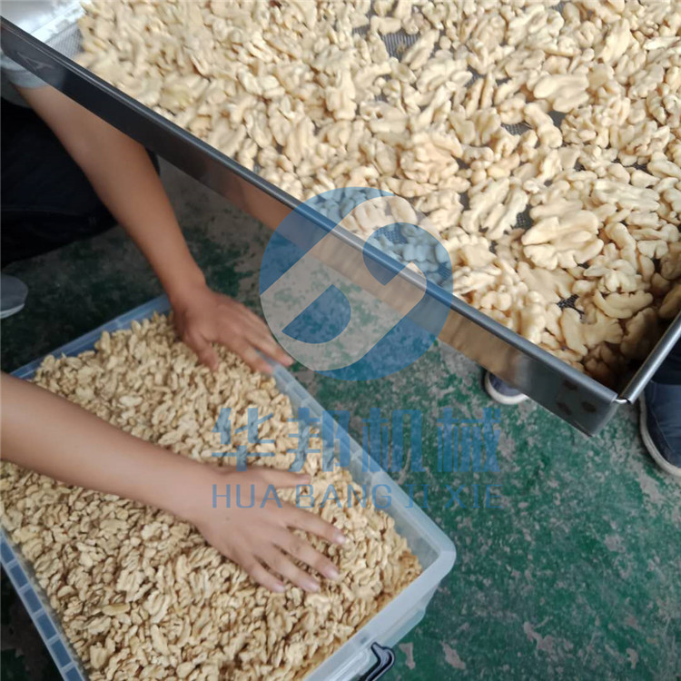 將核桃仁裝進(jìn)烘干機(jī)配套烘盤內(nèi),烘干溫度和烘干時(shí)間可根據(jù)自身工藝設(shè)定。通常烘干溫度設(shè)定在55-80℃。低溫烘干利于保持核桃仁本身的口感和原色。