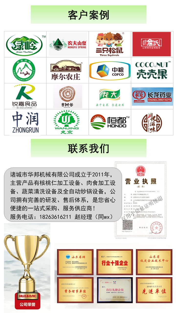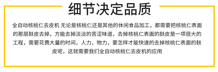 核桃深加工時,需要去掉核桃仁外層的薄皮以脫除苦澀味道。以前工藝較為落后,目前諸城華邦機械的本項創(chuàng)新解決的技術(shù)問題是給廣大核桃產(chǎn)業(yè)提供一種大幅度提高生產(chǎn)效率、節(jié)約用人、純物理脫皮均勻干凈,自動化程度高,不破壞核桃仁內(nèi)在品質(zhì)營養(yǎng)成分,不爛、不碎、不損害外形,果仁完整。
