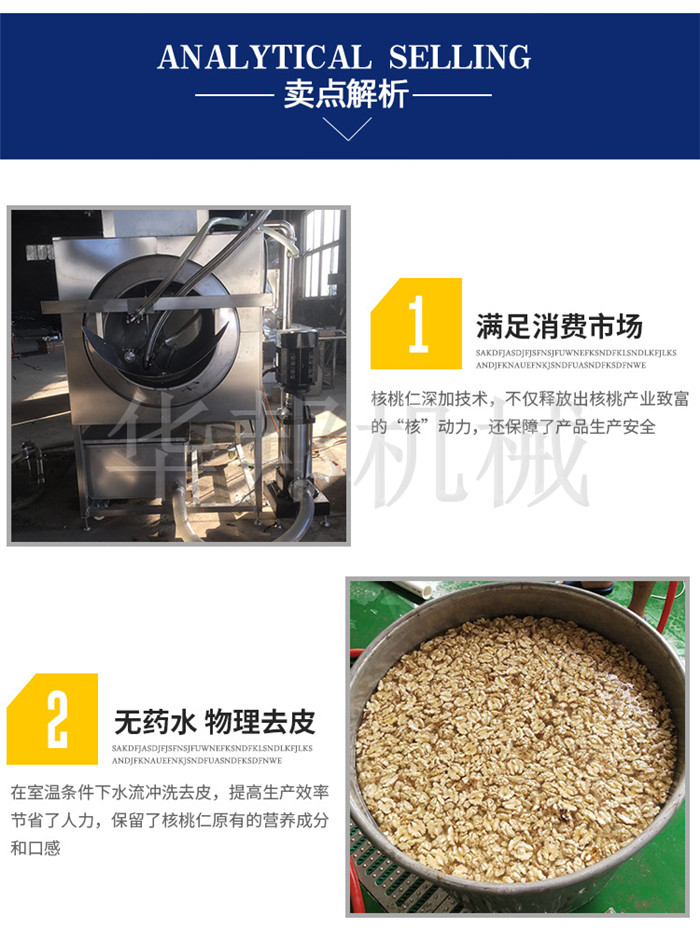 核桃仁的制作流程一般來說新鮮的核桃去掉青皮之后,再去掉硬殼,用水泡一下種仁,把種仁表面的一次淡黃色的內(nèi)種皮去掉,得到的白色種仁再吃就沒有什么澀味了。不去內(nèi)種皮的話,吃起來肯定會(huì)比較苦澀,影響口感。華邦機(jī)械新款核桃仁去皮機(jī),采用滾筒式去皮,滾筒占地面積小,但是工作效率高,產(chǎn)量大。采用高壓噴淋清洗,能360度的將核桃仁的凹凸表皮去掉。直接采用自來水等清水去皮,不加藥水,色澤好,口感佳。脫皮時(shí)間短,12分鐘左右就可以完全脫掉,0破損,果仁完整。脫皮后的水可以直接排放,0污染
